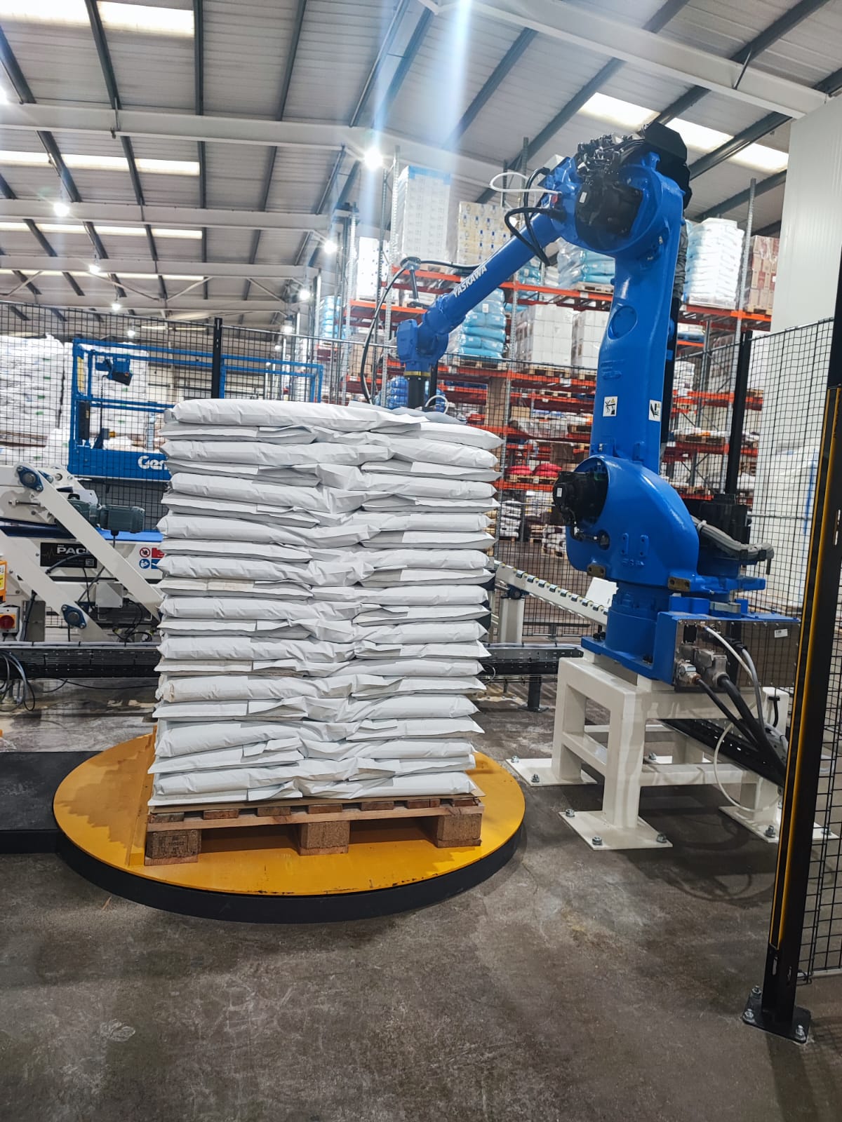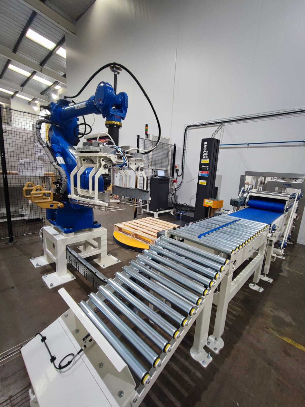 At the core of the system is the Motoman GP180-120 industrial robot, providing high payload capability, rapid cycle performance, and precise layer placement for a wide range of products and pallet configurations. The system is operated via an interactive 10” Inovance HMI, offering intuitive control, real-time diagnostics, guided workflows, and seamless recipe management.
